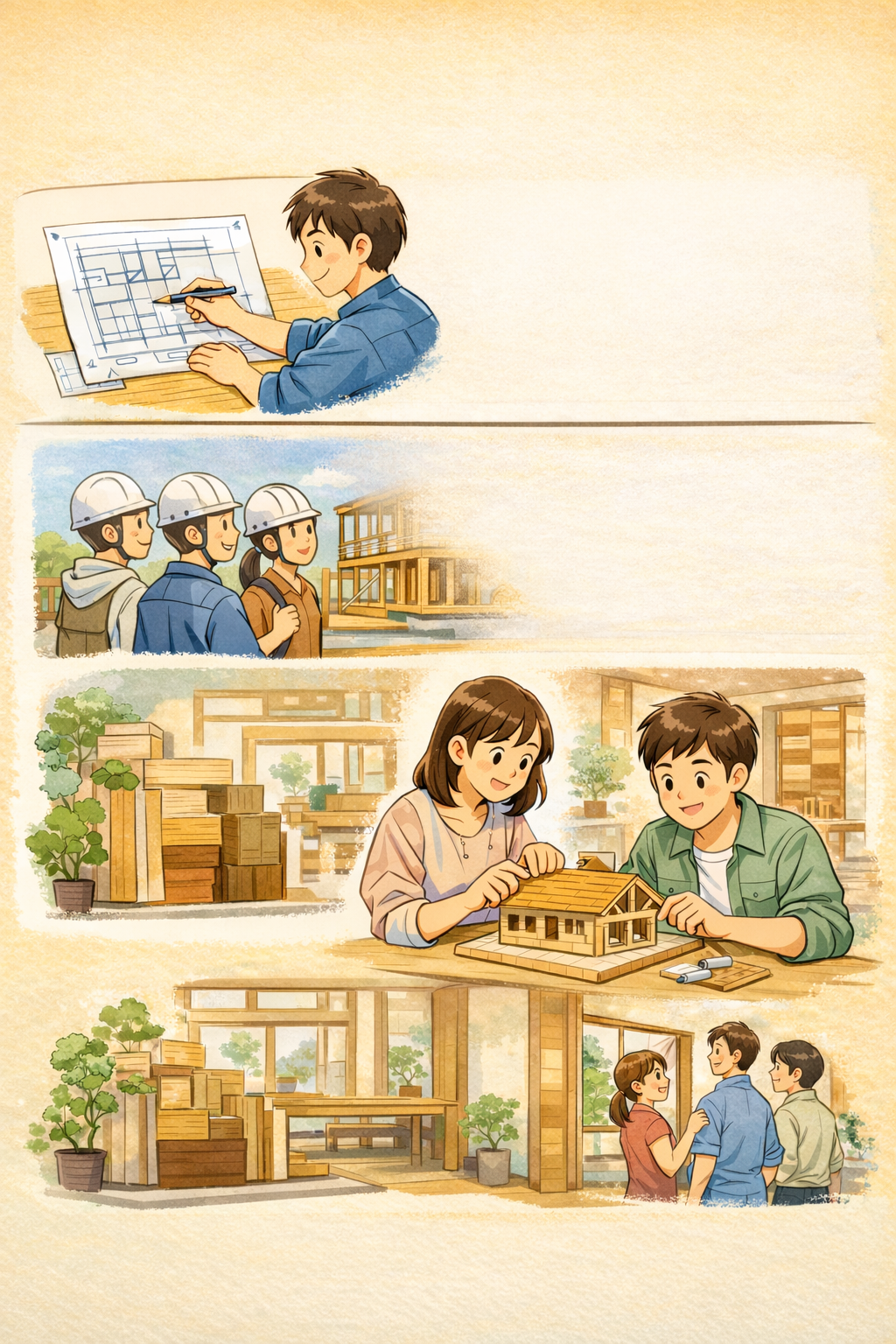 講義では、木造建築の基本である一戸建て住宅の構造や法規を座学で学びながら、ご自身で手描きの図面を作成します。さらに、建築現場で施工方法を見学したり、住宅展示場で実際の間取りを確認したり、ショールームで素材に触れるなど、現場体験を通して理解を深めていきます。また、描いた図面をもとに模型を製作することで、図面と実際の空間の関係を体感しながら学ぶことができます。このプログラムでは、知識だけでなく、実際に体験しながら木造建築設計の基本を身につけることを大切にしています。